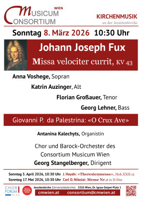 Unser Chor besteht aus musikalisch qualifizierten Laien, die monatlich eine Messe aus der Barockzeit, der Wiener Klassik oder Romantik in der Jesuitenkirche (Universitätskirche) von innen erleben, mit Freude singen und einer großen Zuhörerschaft zu Gehör bringen. Im Orchester spielen Mitglieder der Wiener Symphoniker. Es dirigiert Georg Stangelberger.